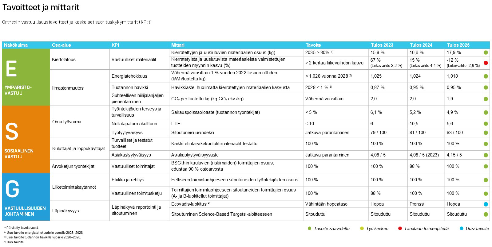 Orthexin vastuullisuusstrategiaa, vastuullisuuden keskeisiä osa-alueita ja niille asetettuja mittareita, tavoitteita ja saavutettuja tuloksia vuonna 2025 on kuvattu alla.